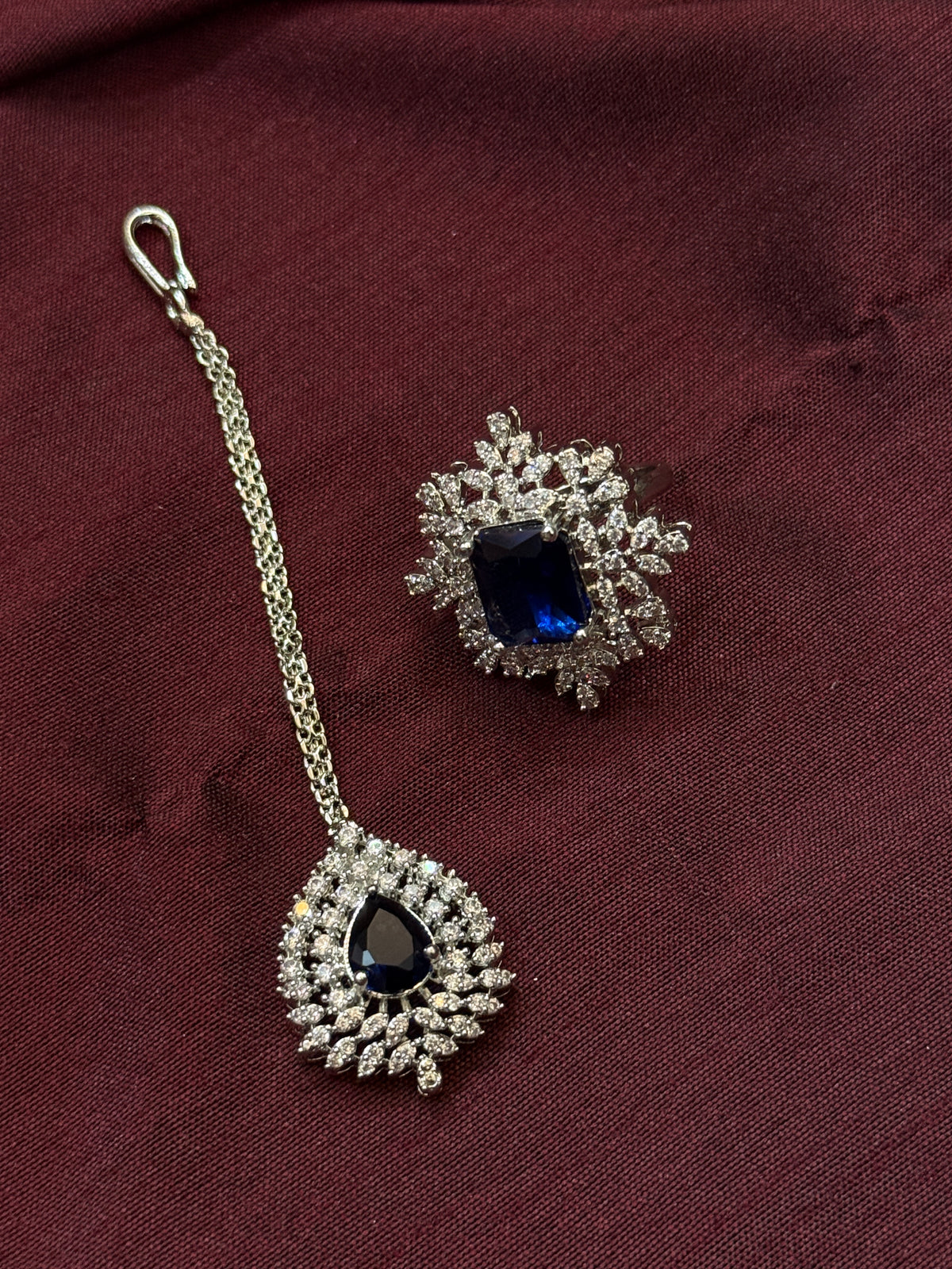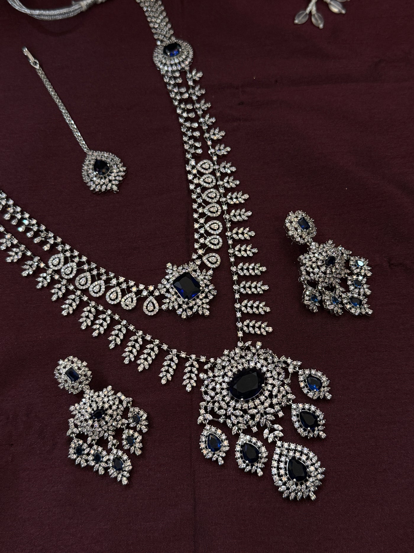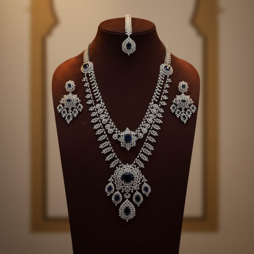 Adorn yourself with the Blue Grace AD Set, a masterpiece designed for the modern royal. Featuring brilliant, high-quality American Diamonds and rich, sapphire-like stones, this layered set exudes heritage luxury. It's the perfect choice to elevate your grandest ensemble, promising unmatched sparkle and commanding attention with every turn.