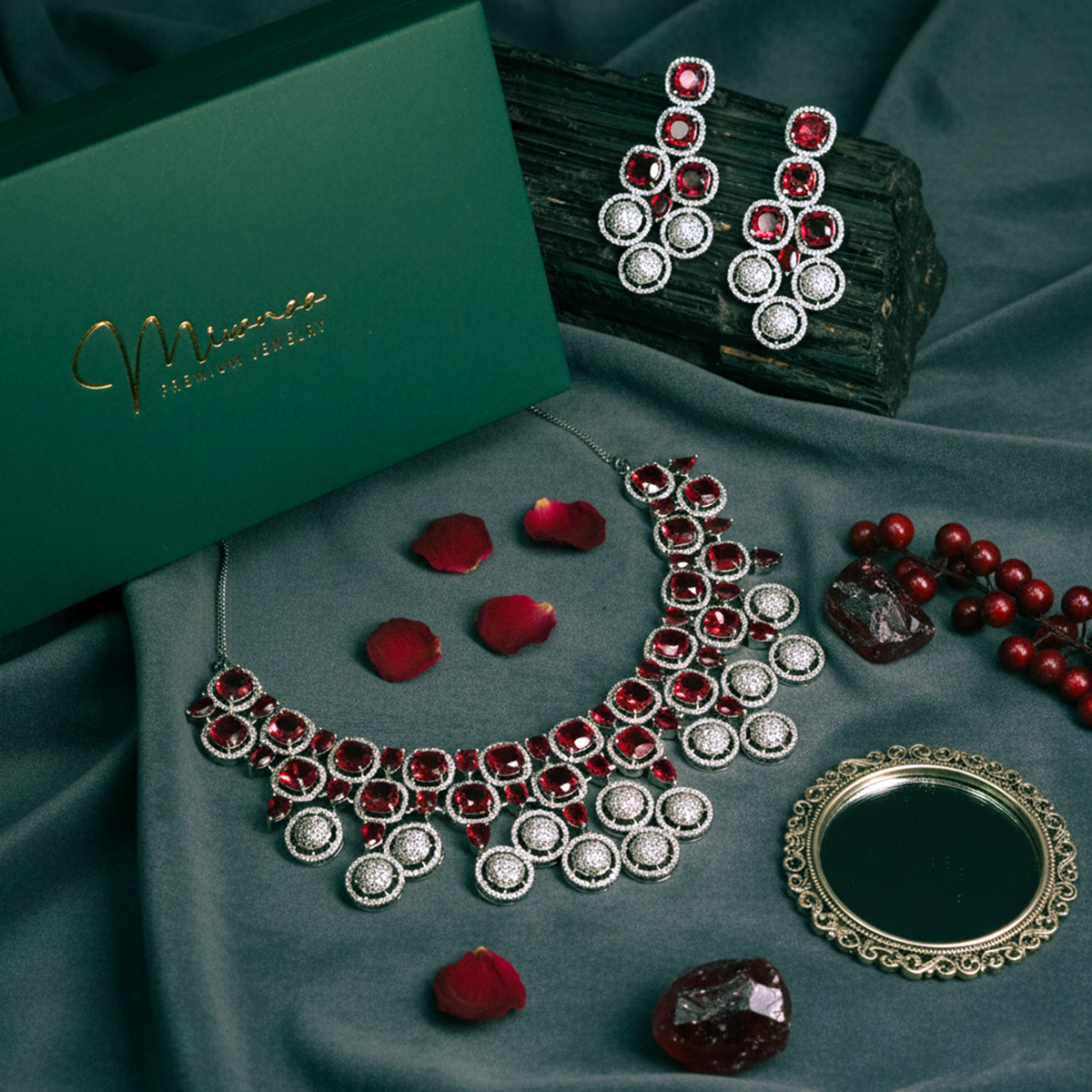 Elevate your elegance with this Red Wine American Diamond Necklace Set, crafted to make a bold and luxurious statement. Designed with rich wine-red stones surrounded by shimmering American diamonds, this set beautifully blends classic charm with contemporary sophistication.