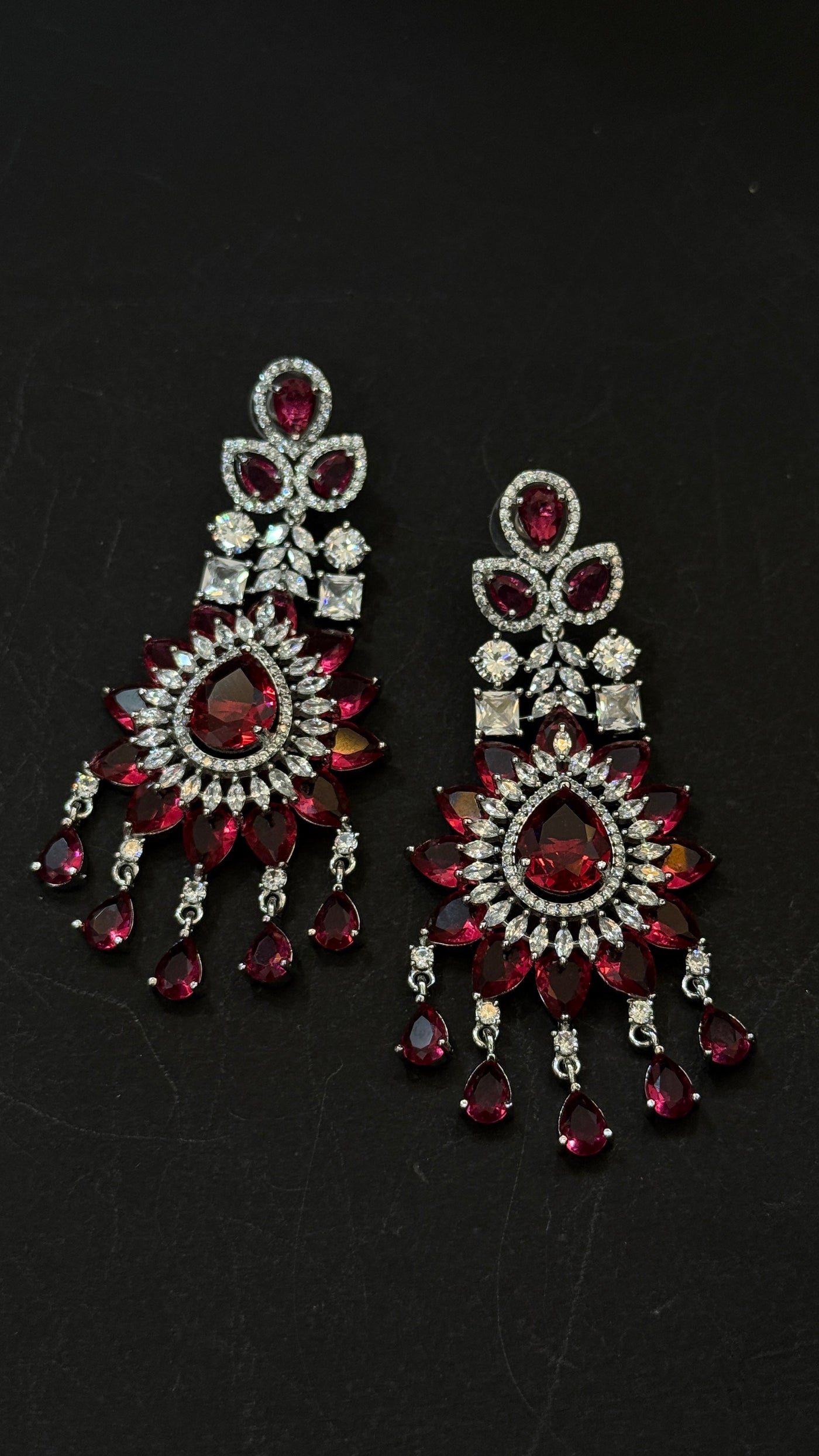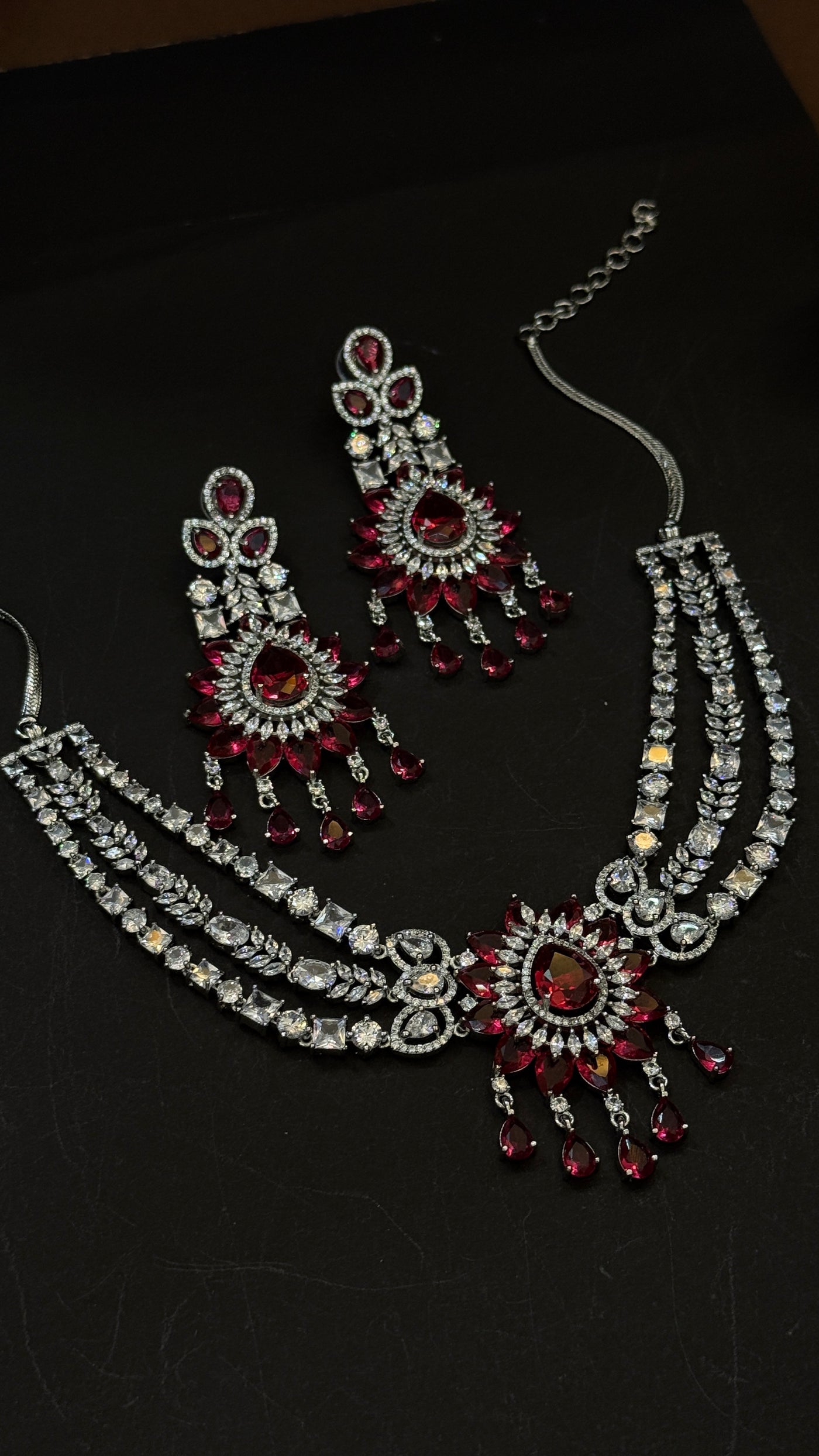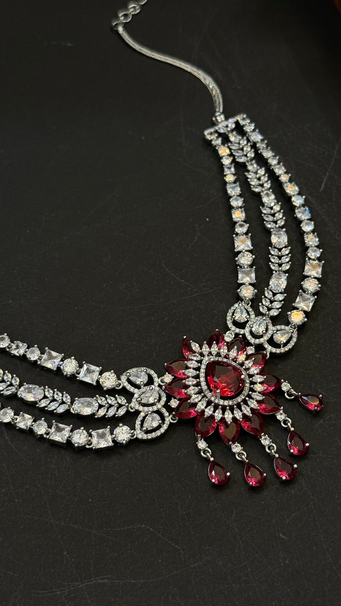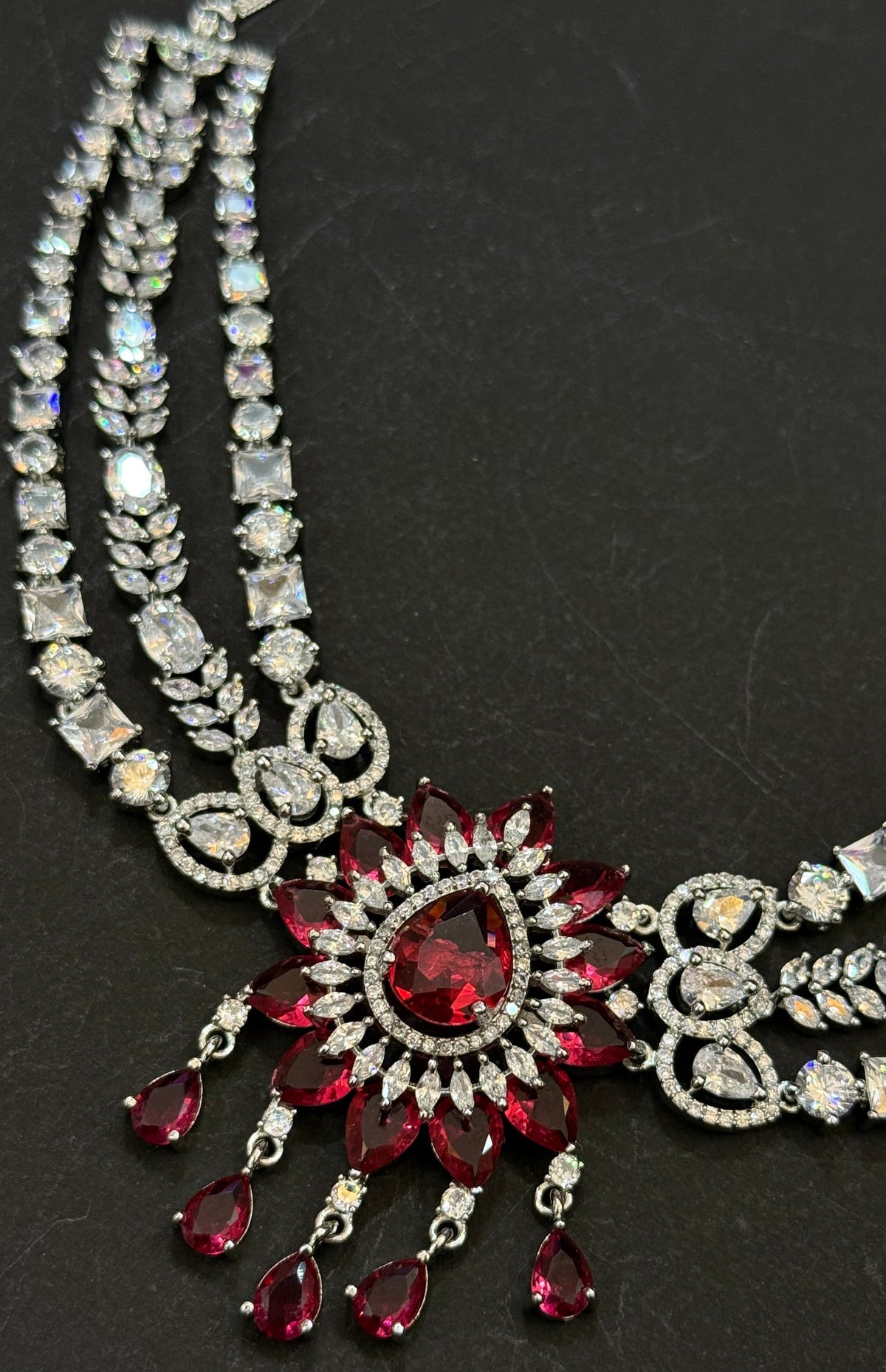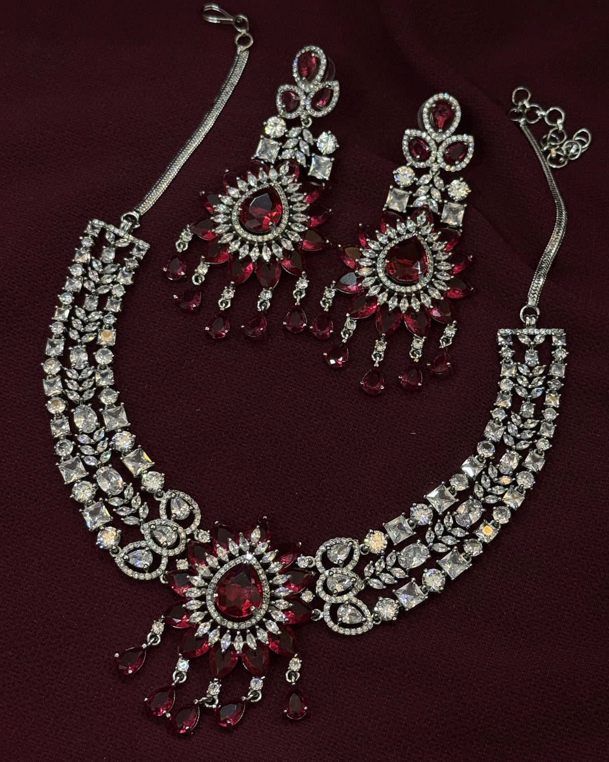 Make a statement of timeless elegance with this luxury ruby red American diamond necklace set, designed for women who love bold glamour with a modern Indian touch. Featuring a radiant teardrop ruby centerpiece surrounded by shimmering high-quality American diamonds.