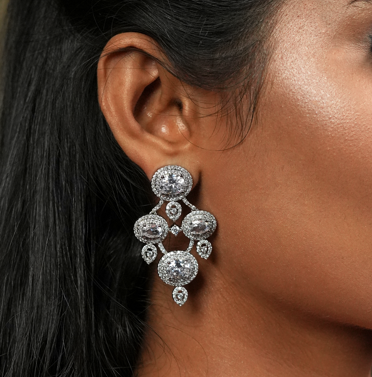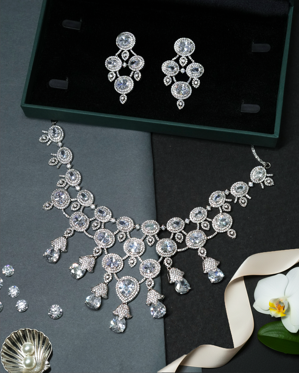 Add a touch of glamour with the Silver Glow American Diamond Necklace Set. Designed with sparkling AD stones, this elegant piece enhances any festive or party look effortlessly. Its graceful shine and fine detailing make it a timeless addition to your jewelry collection.