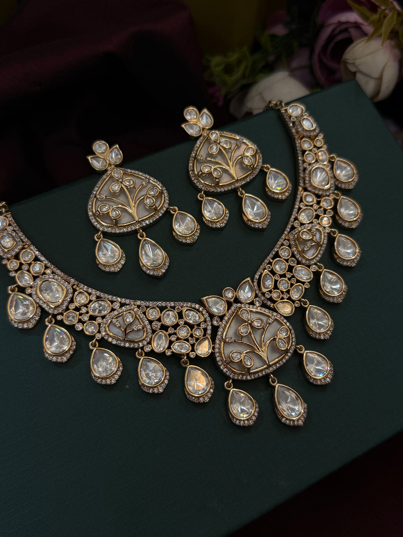 Each element of the necklace showcases delicate floral and teardrop motifs, embellished with uncut stones and surrounded by micro-set crystals that enhance its brilliance. The matching earrings mirror the necklace’s intricate craftsmanship, creating a harmonious and luxurious look perfect for bridal and festive occasions.