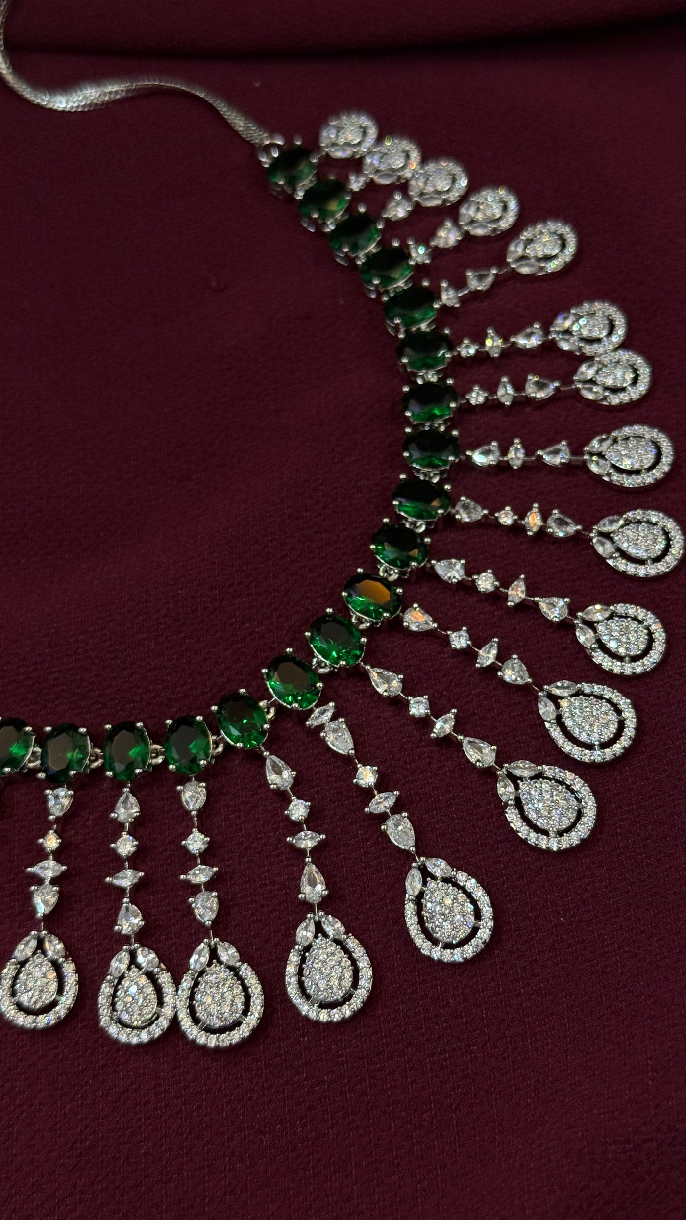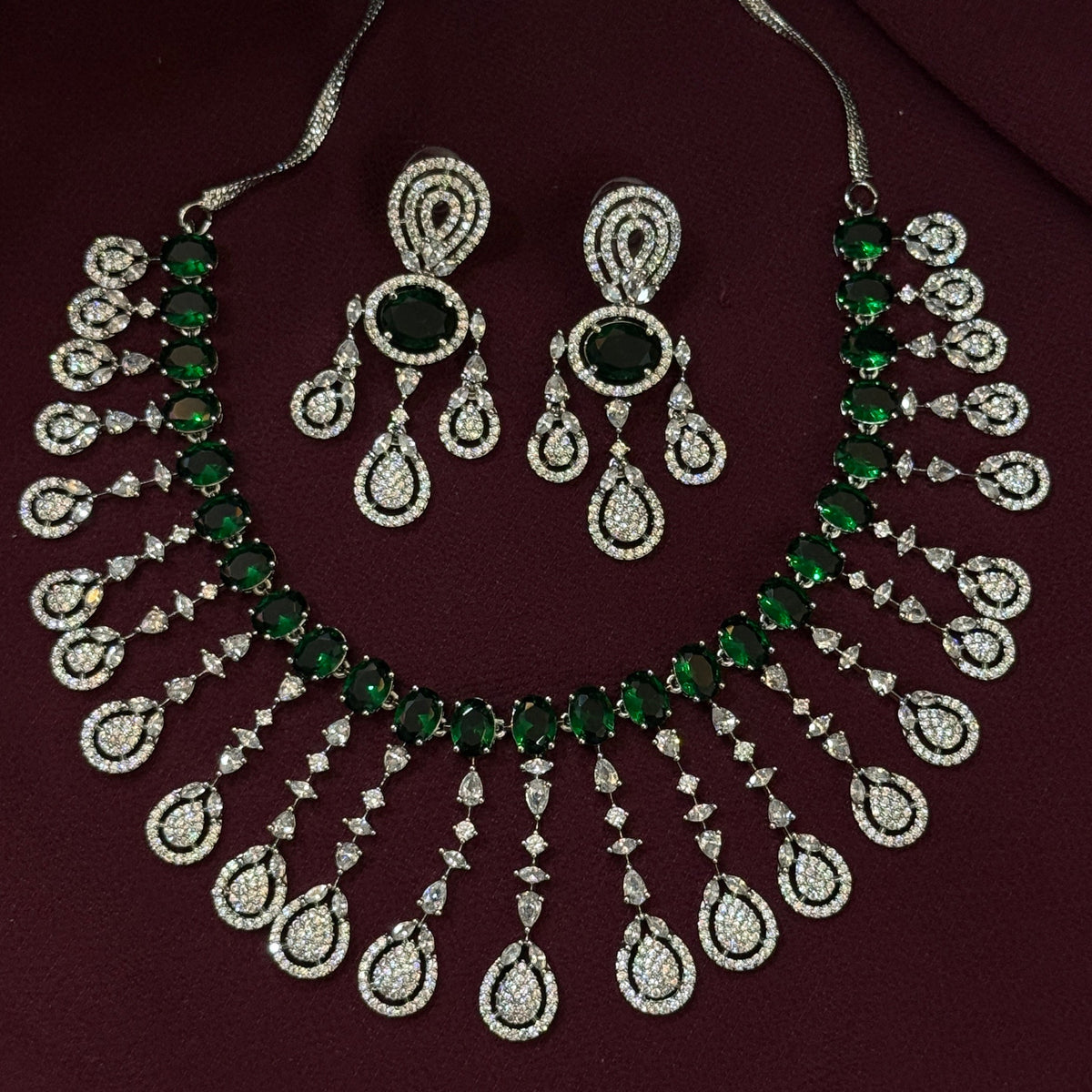 This statement necklace and earring set features shimmering American diamonds and deep emerald-green stones arranged in a cascading pattern that radiates regal charm.