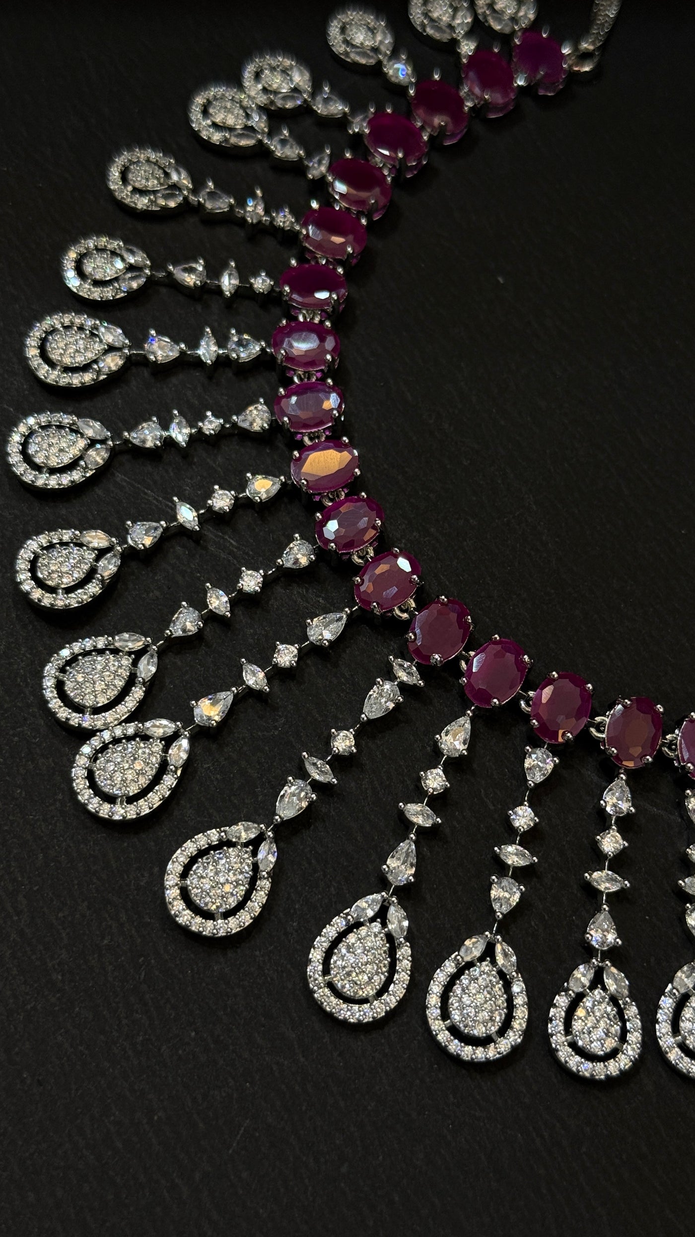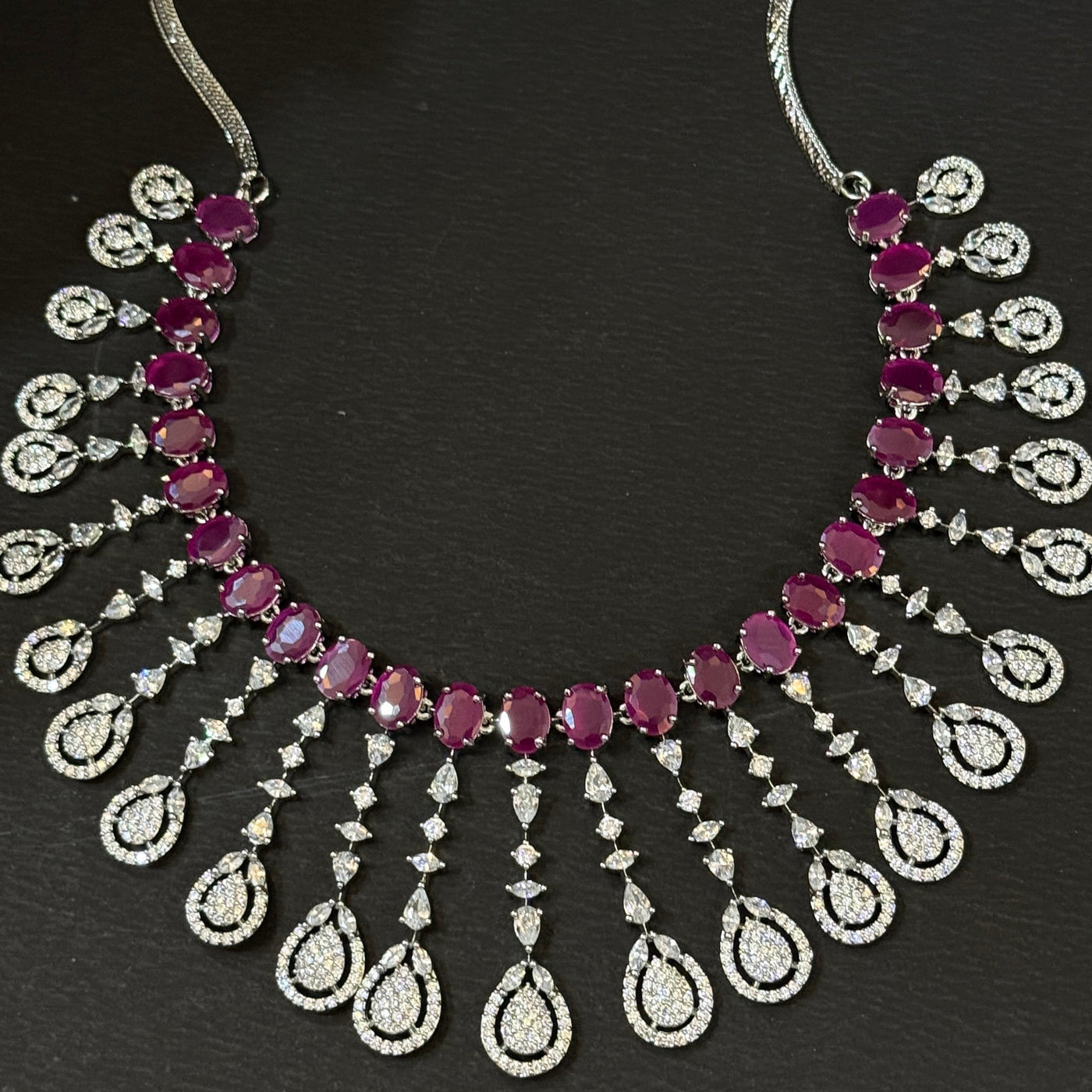 Embrace the charm of timeless beauty with the Royal Ruby Radiance American Diamond Necklace Set, a breathtaking blend of elegance and craftsmanship. This exquisite jewelry set features a statement necklace and matching earrings adorned with premium ruby-red stones surrounded by sparkling American diamonds, creating an aura of sophistication and regal allure.