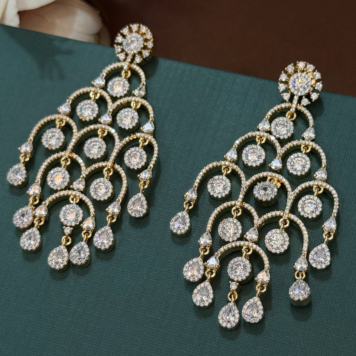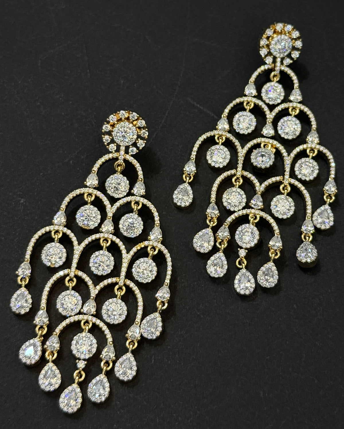 Add royal sparkle to your look with these stunning American Diamond chandelier earrings. Designed with multiple layers of shining round and pear-cut stones, these gold-tone earrings give a rich and elegant finish. Perfect for weddings, receptions, and festive occasions. Lightweight feel with premium quality shine.