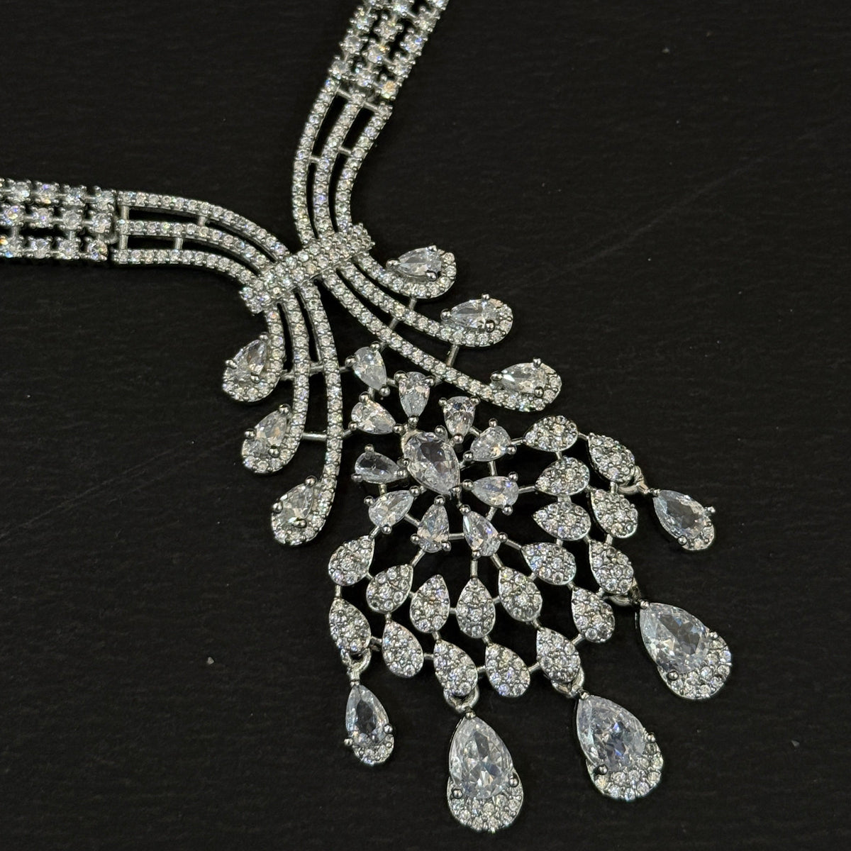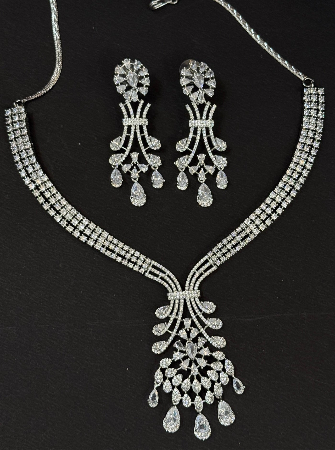 This exquisite diamond-cut cubic zirconia necklace and earring set. Designed to shimmer and sparkle, this stunning jewelry set is the ideal accessory for parties, weddings, and any special occasion where you want to make a statement. The intricate craftsmanship ensures a luxurious look without the premium price tag.