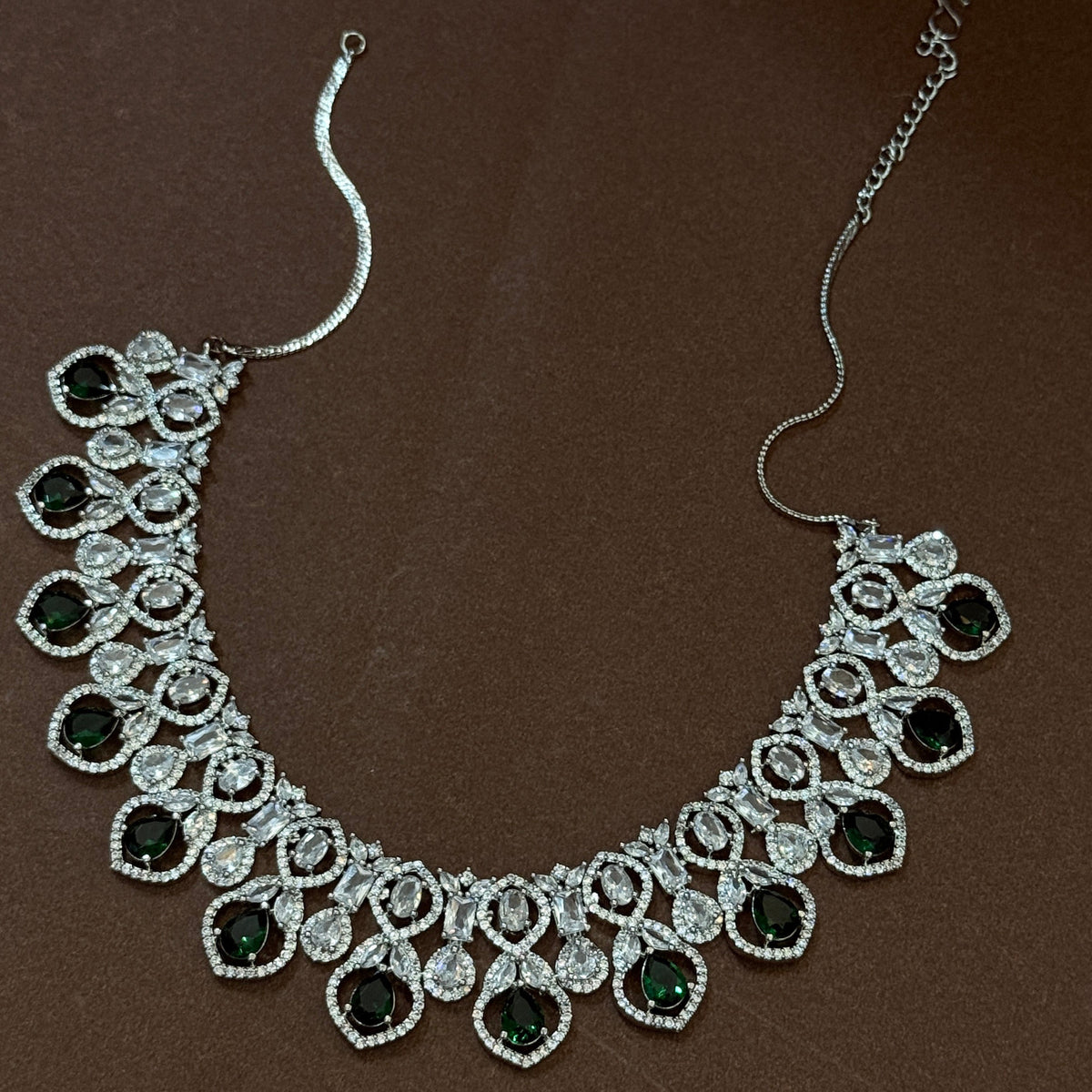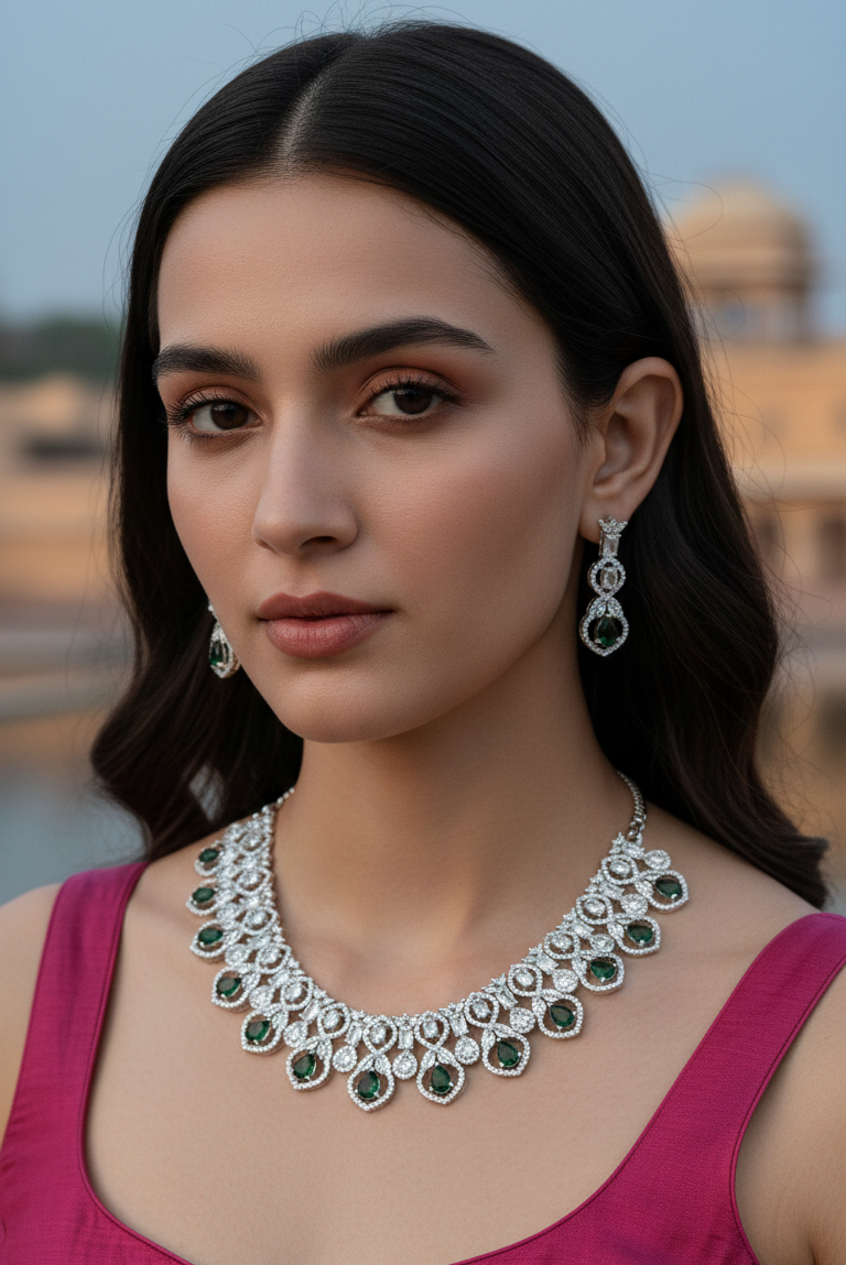 This beautiful green crystal necklace set is designed with sparkling white stones and deep emerald green drops. The elegant drop design gives a royal and classy look. Perfect for weddings, parties, festive wear, and special occasions. Lightweight, shiny, and made with high-quality finish for long-lasting beauty.