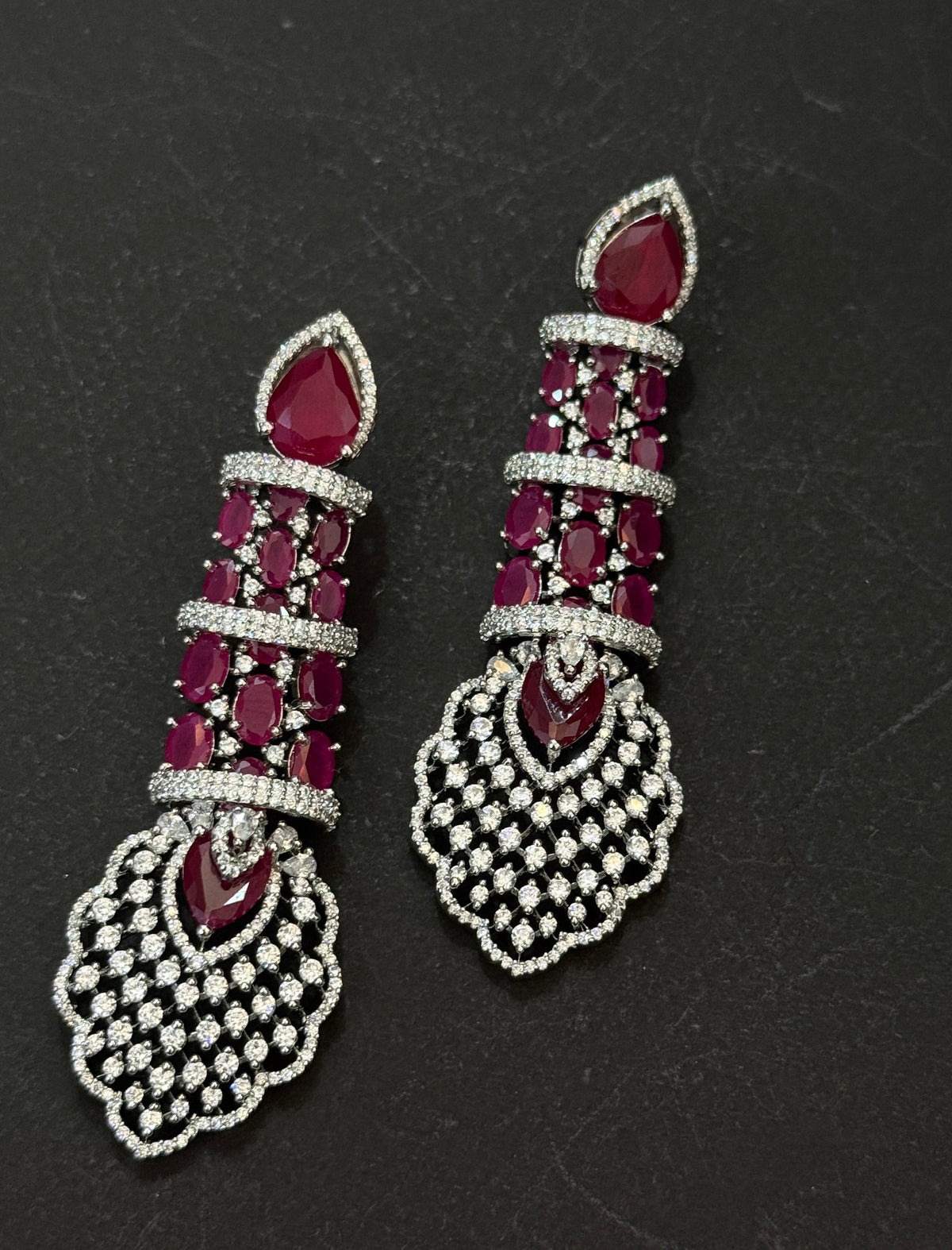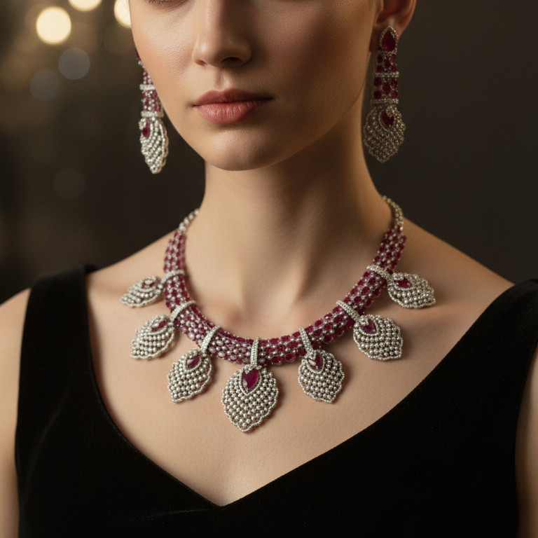 This Elegant Maroon Crystal Wedding Jewellery Set is designed to give you a royal and graceful look. The necklace features rich maroon oval crystals with sparkling American diamonds in a beautiful leaf pattern. It comes with matching long drop earrings that add extra shine and elegance. Perfect for bridal wear, receptions, and festive occasions.