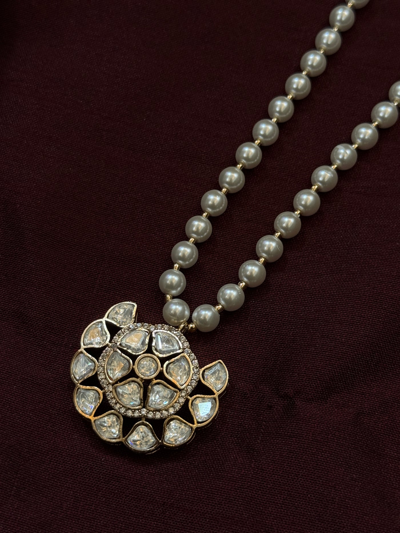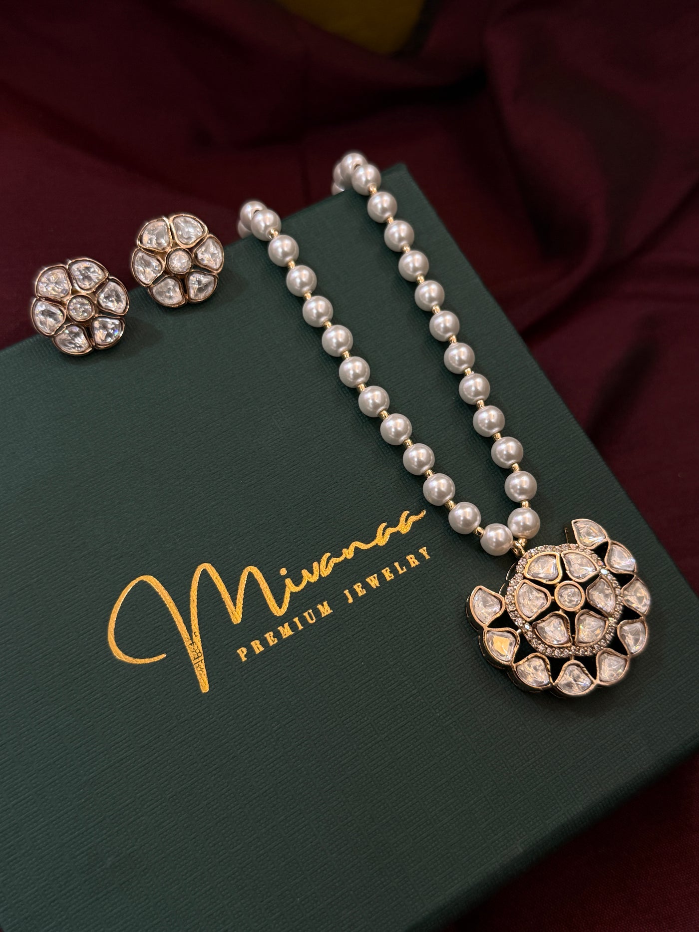 Handcrafted to perfection, the set features a statement pendant adorned with fine moissanite polki stones, delicately framed in a floral Kundan design. The lustrous pearl string adds a touch of sophistication, while the matching stud earrings.