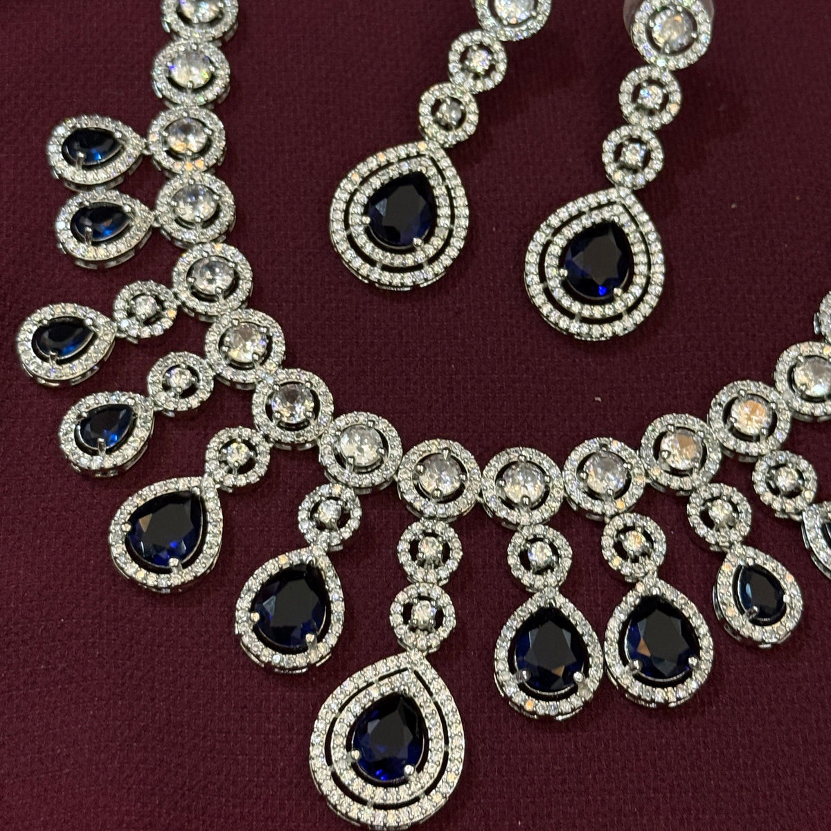 Crafted with a dazzling arrangement of deep blue sapphire teardrop stones, this necklace is beautifully accented with brilliant diamond-like crystals set in a graceful cascading pattern. Each stone is meticulously.
