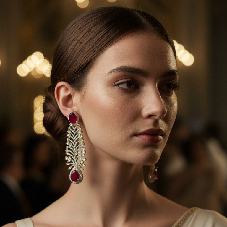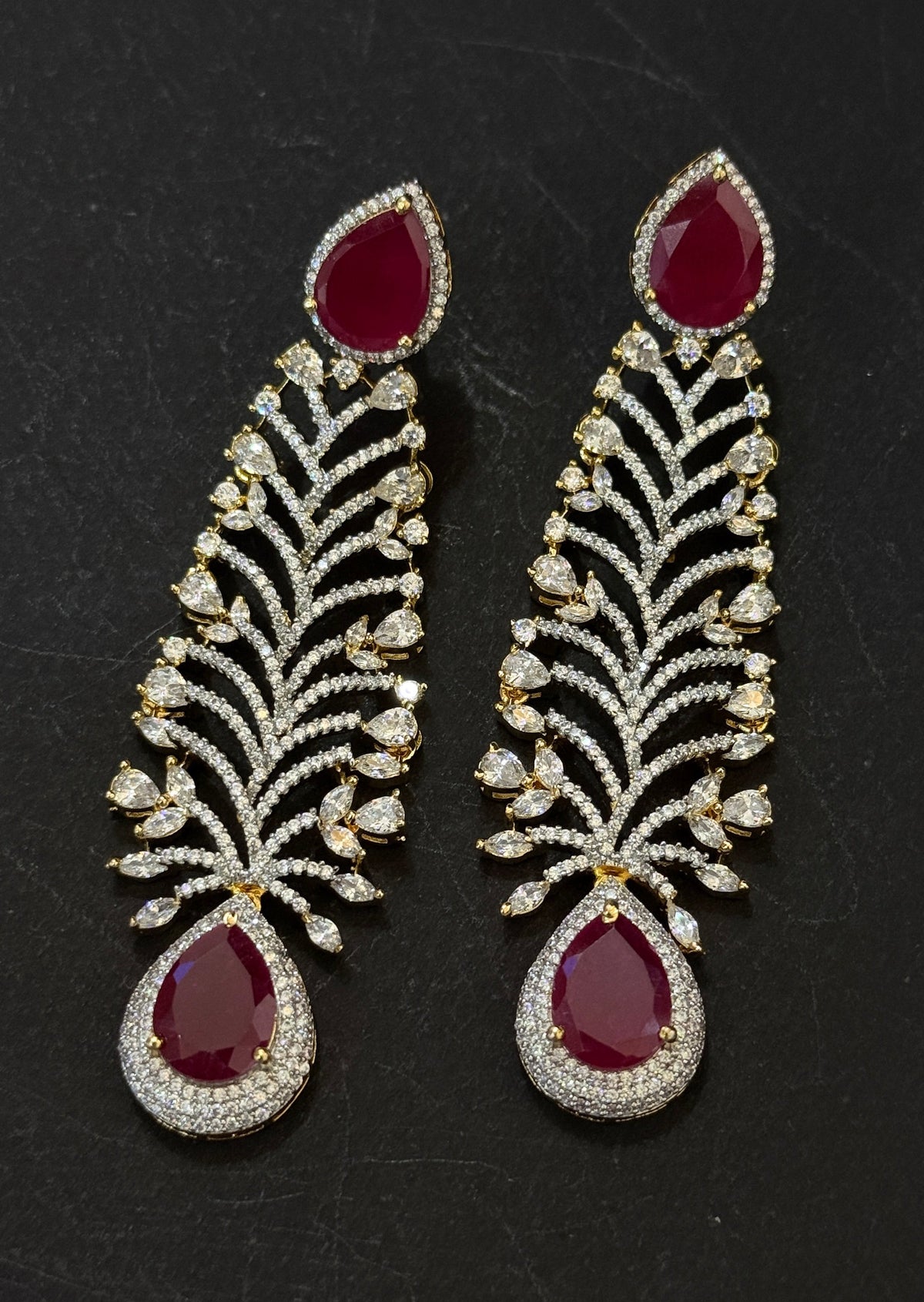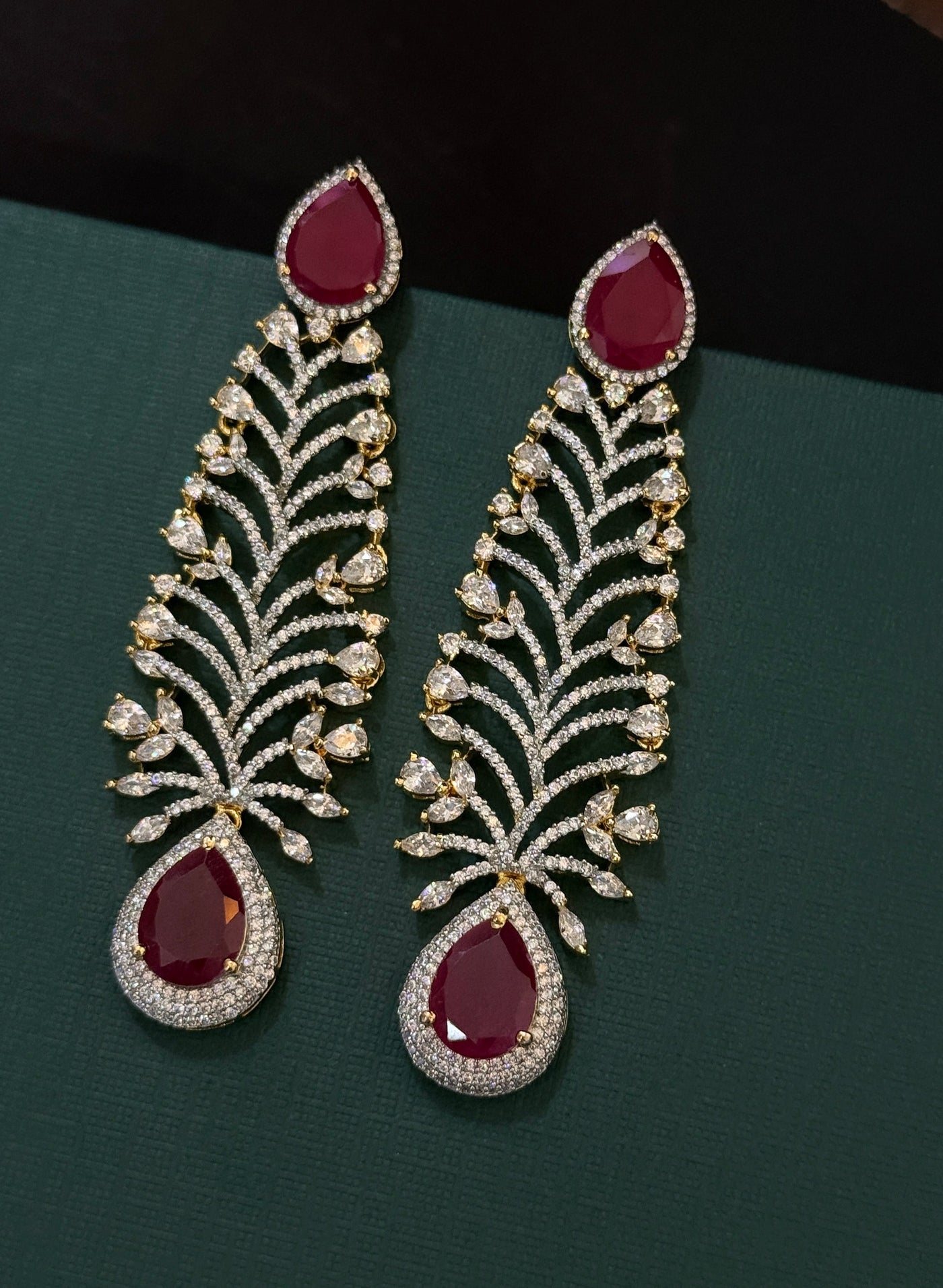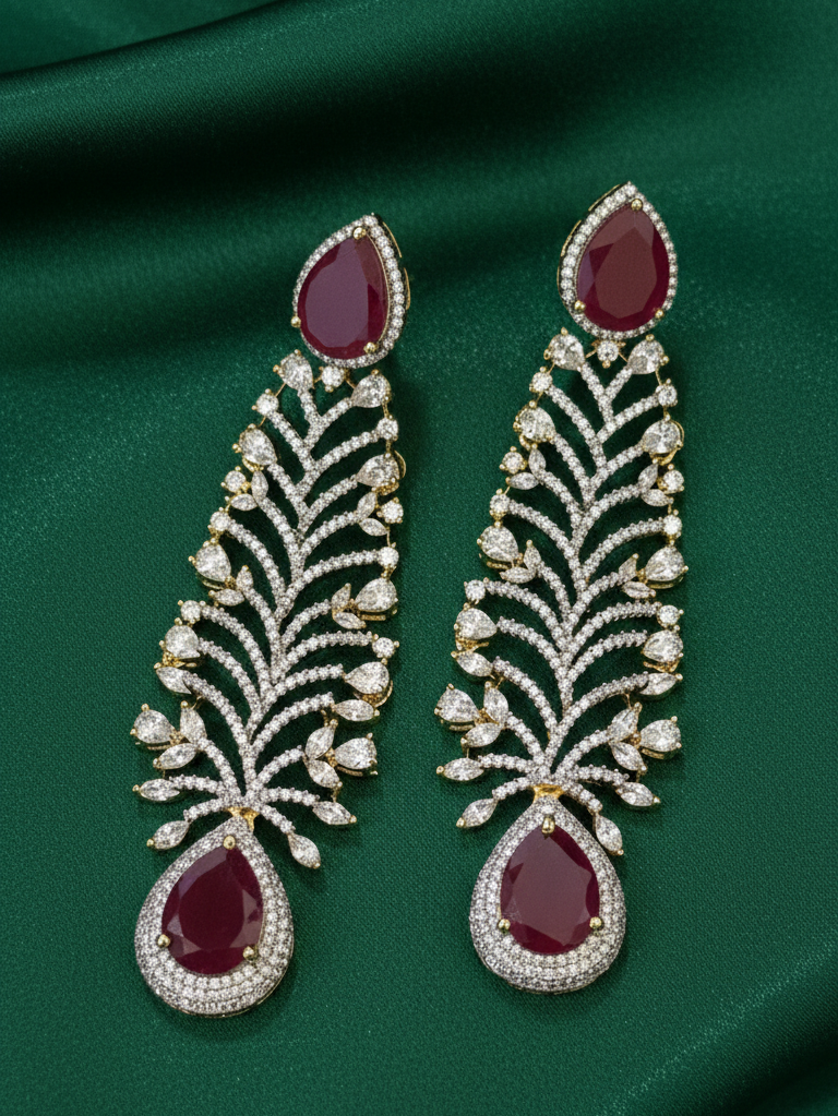 These ruby red teardrop long earrings are designed with sparkling American diamonds in a beautiful leaf pattern. The rich red stones give a royal and elegant look, perfect for weddings and festive wear. Made with high-quality finishing, these earrings shine brightly and feel comfortable to wear.