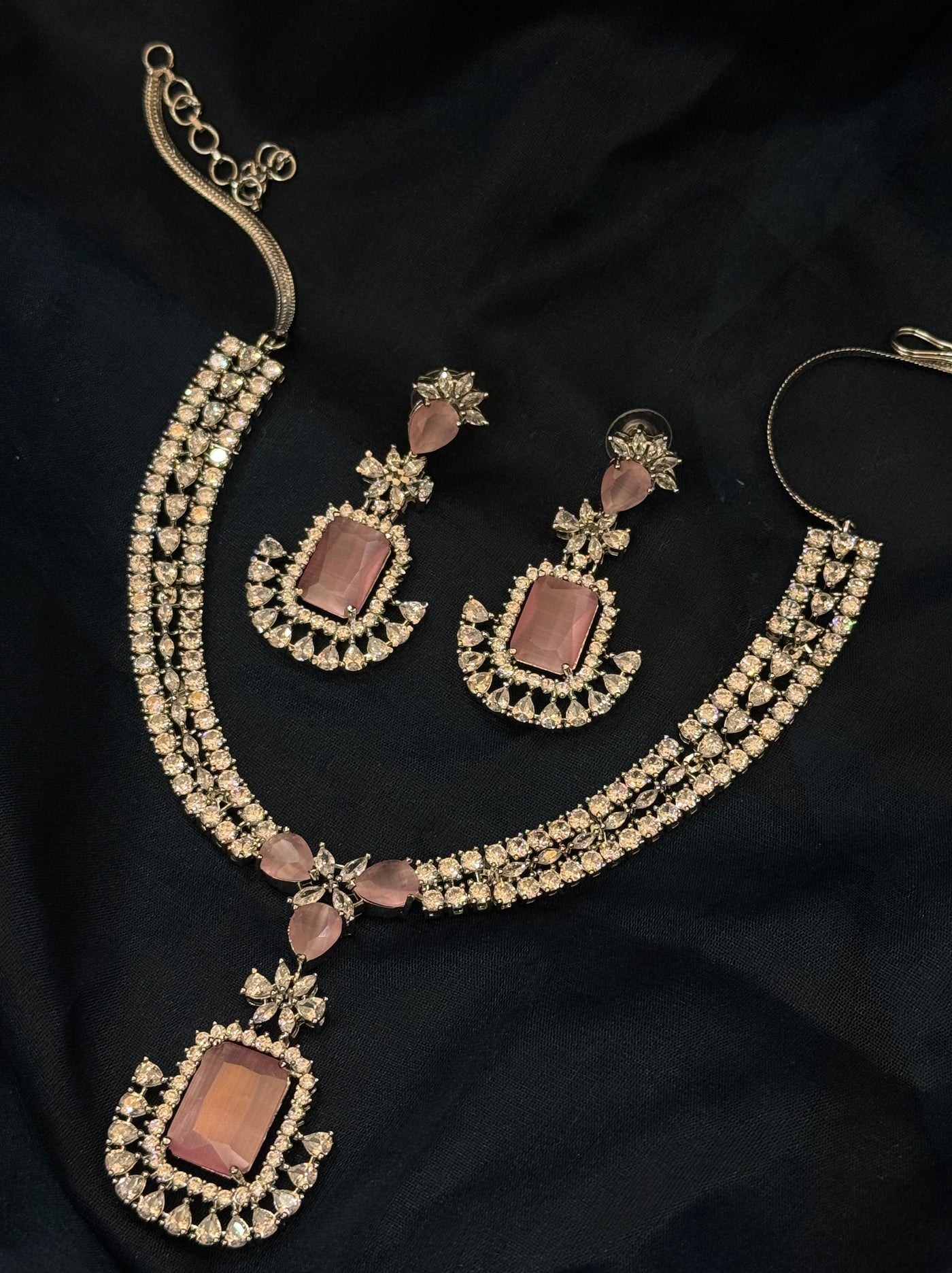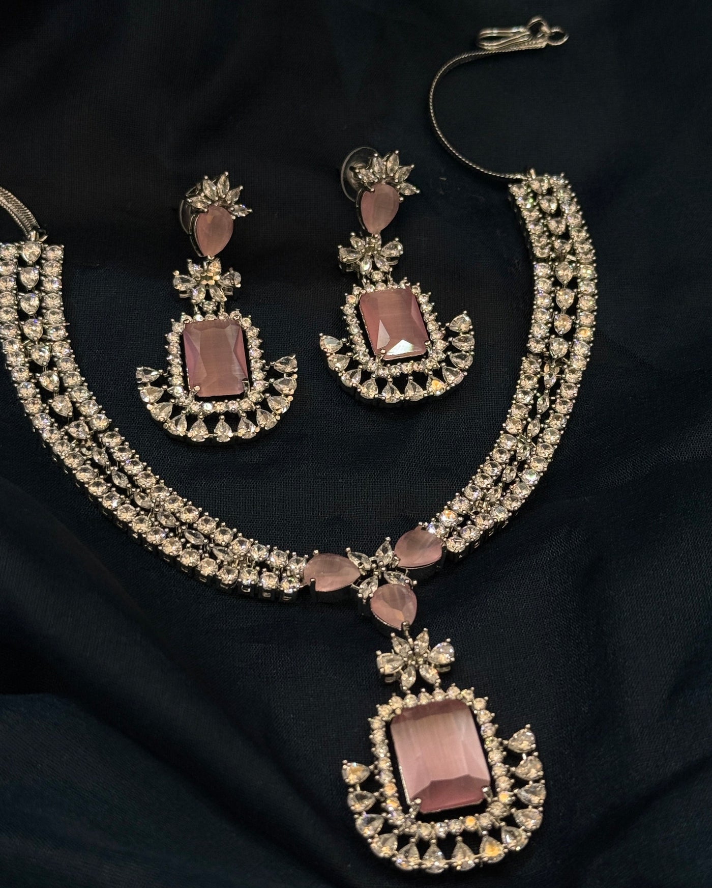 Add soft elegance to your look with these Blush Pink American Diamond Necklace Set. Designed with premium American diamonds and a beautiful pink stone center, these neckset give a rich and classy shine. Perfect for weddings, parties, and festive wear.