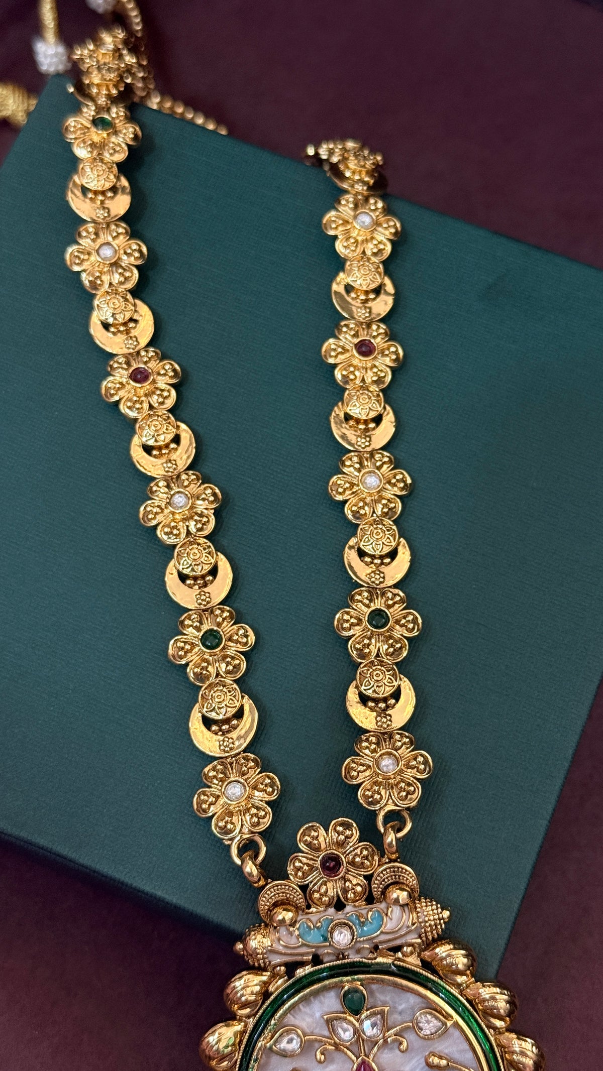This beautiful gold plated necklace set is designed with traditional Kundan and Meenakari work. The pendant has floral design with green and pink stones and fine detailing. It comes with matching jhumka earrings, perfect for weddings, festivals, and special occasions.