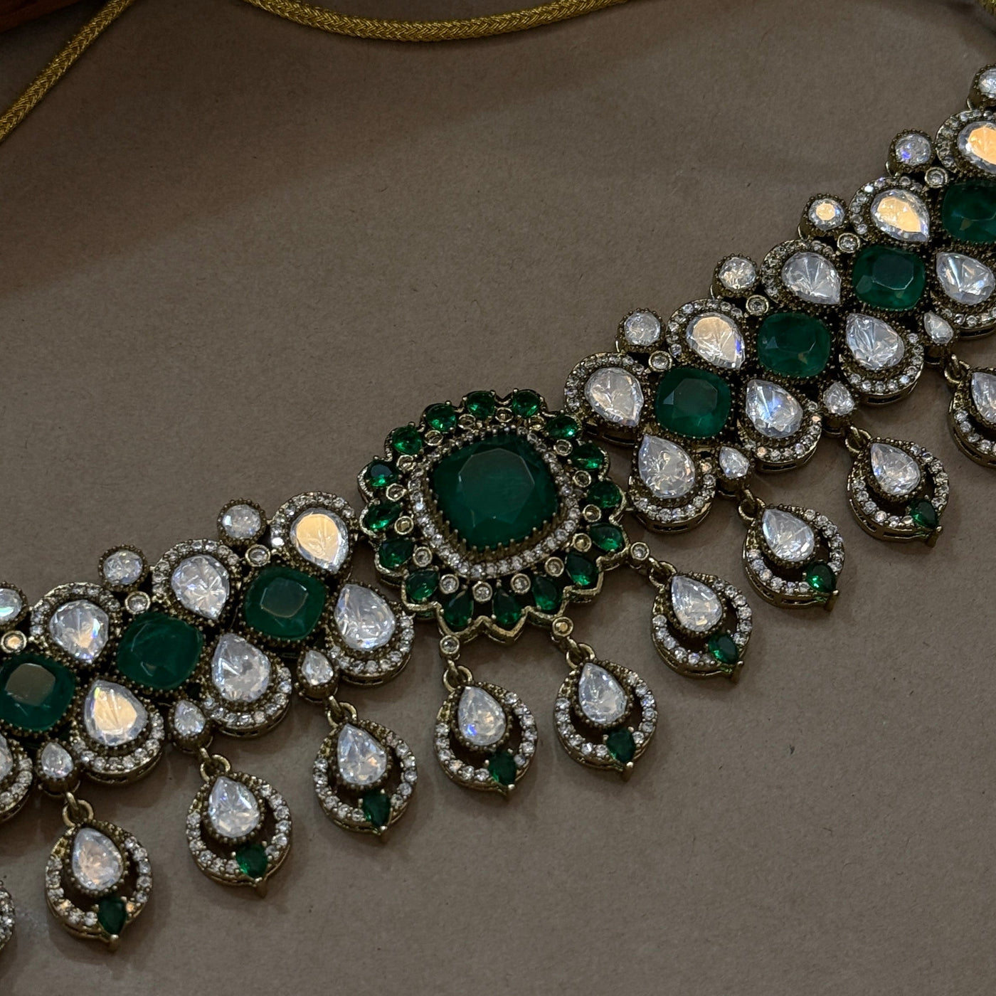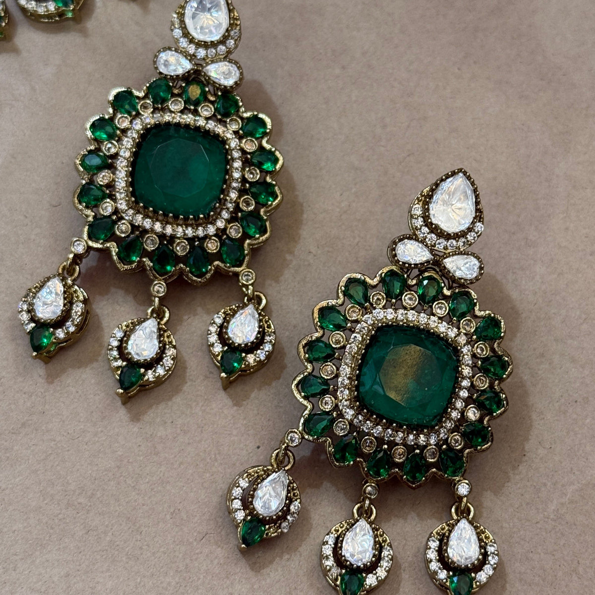 • Rich emerald-green stones with polki-style accents