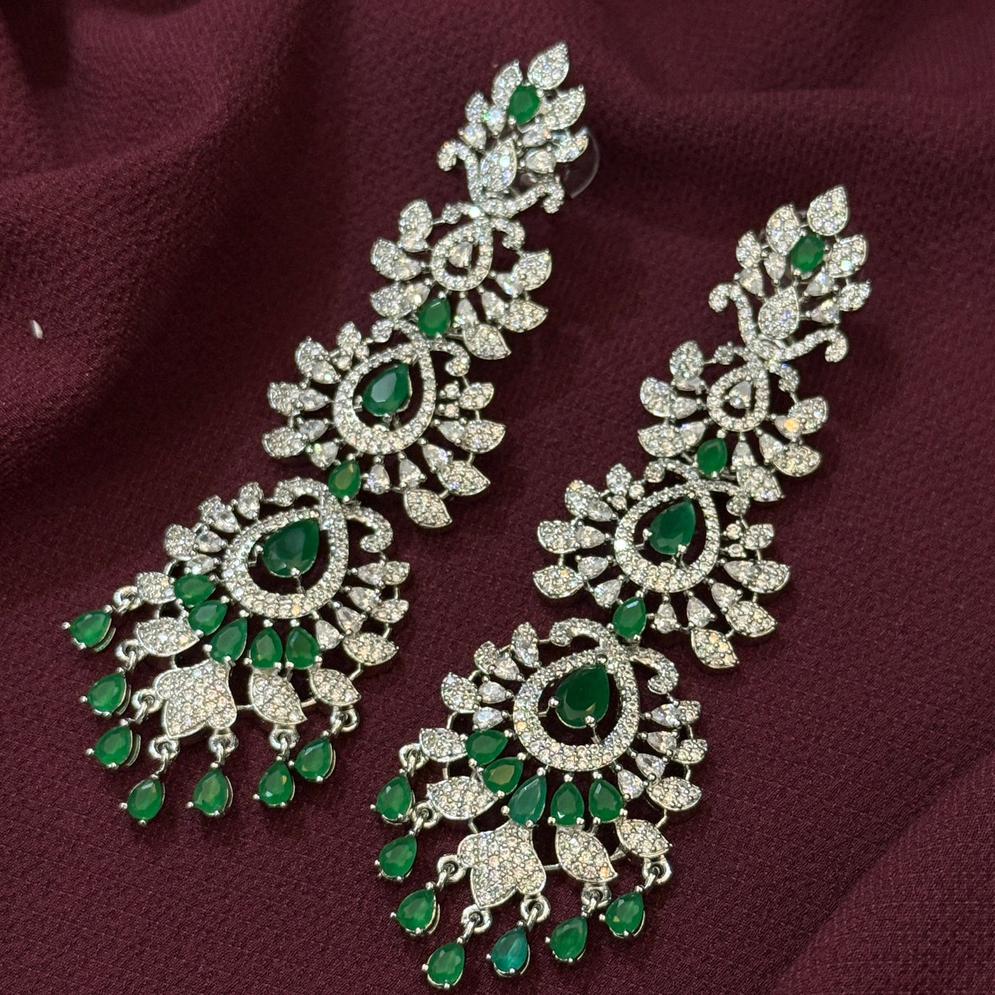Elevate your festive and bridal look with these stunning emerald green American Diamond earrings. Designed with sparkling AD stones and rich green teardrop accents, they offer a royal, diamond-like shine with a premium finish. Perfect for weddings, parties, and special occasions.
