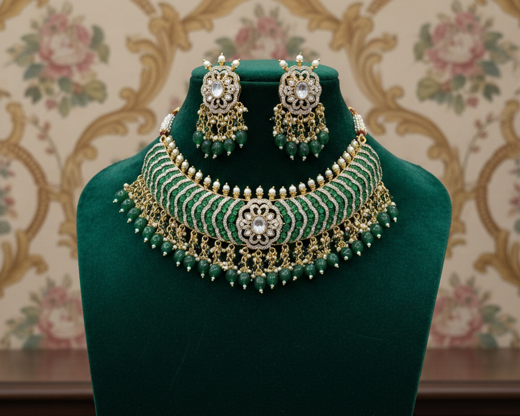 This beautiful green Kundan Polki bridal necklace set is made with high-quality stones, pearls, and green beads. The choker-style necklace and matching statement earrings give a rich royal look. Perfect for weddings, bridal wear, festive occasions, and traditional outfits. This jewellery set adds elegance and luxury to your look.