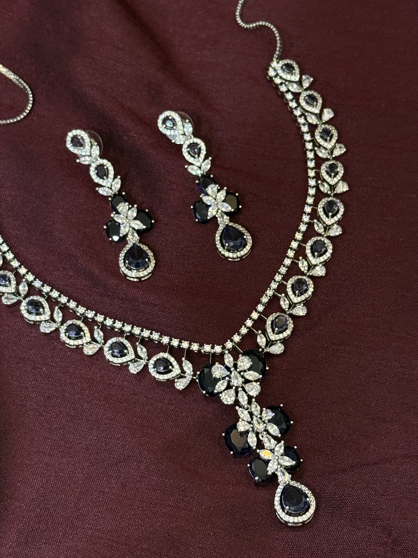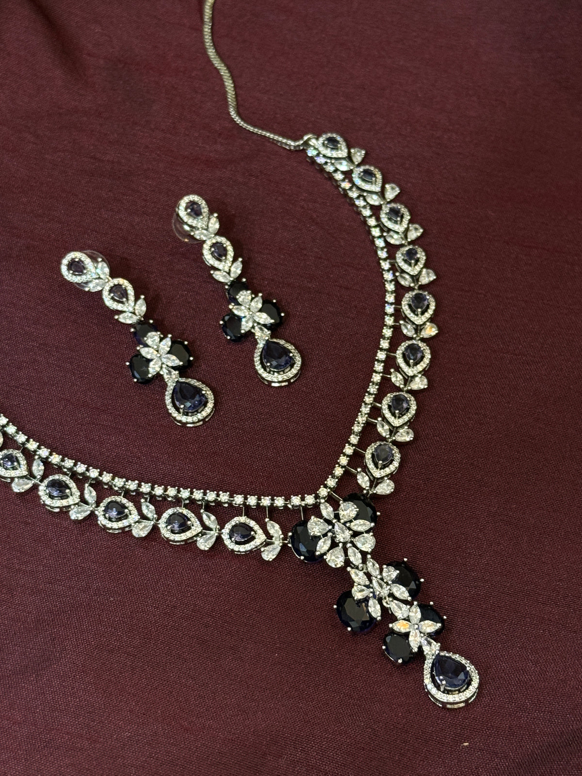 The necklace is paired with perfectly coordinated drop earrings that mirror the pendant’s brilliance, creating a harmonious and luxurious look. Crafted with premium-quality American diamonds, this set delivers exceptional sparkle and a high-end finish, making it ideal for cocktail evenings, receptions, parties, and special celebrations.